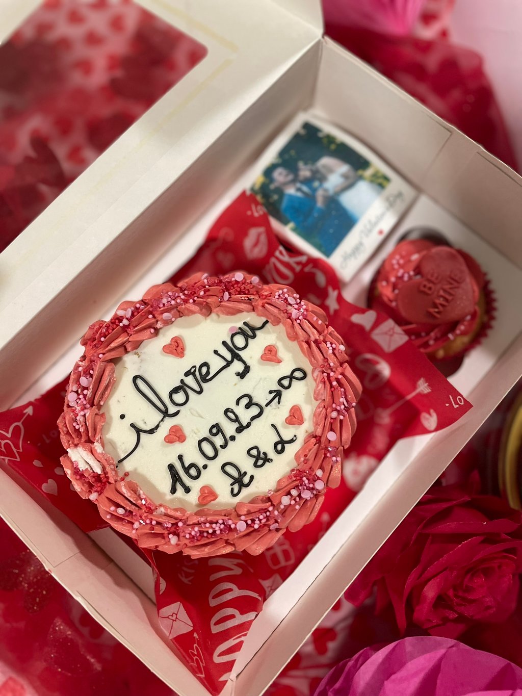 - deux cupcakes délicatement décorés dont un personnalisé avec la photo de votre choix en format polaroid (un cupcake chocolat coeur nutella et un cupcake coeur framboise).