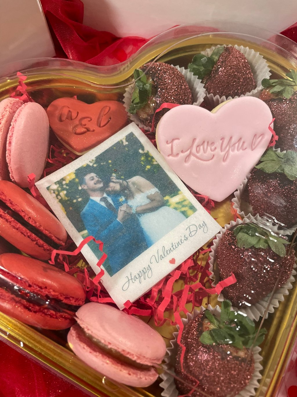 - des biscuits personnalisés dont un format polaroid avec la photo comestible de votre choix, un petit cœur avec vos initiales et un cœur I Love You
